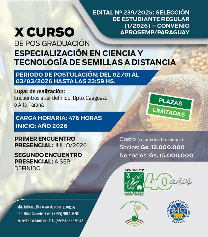 Siguiendo con nuestra misión de “Fortalecimiento de las capacidades técnicas de los profesionales del Sector semillero”, para el año 2026 venimos planificando varias actividades a ser comunicadas por medio del R-03-01 Plan Anual de Capacitaciones en la página web de la Aprosemp, la realización del Posgrado Especialización en Ciencia y Tecnología de Semillas en la modalidad a distancia forma parte del acuerdo de cooperación entre Aprosemp y la Universidad Federal de Pelotas Brasil.
